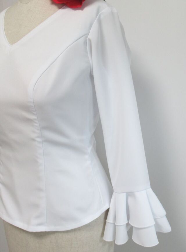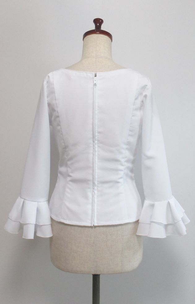 ブラウス:Vネック(後ろファスナー)、7分袖2段フリル