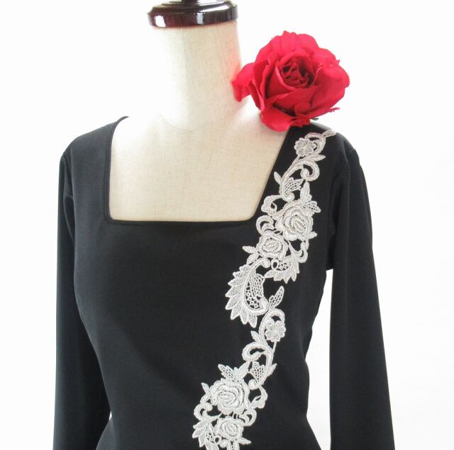 真っ黒な衣装でも寂しくならないようにシルバーモチーフとシルバーのトーションレースをアクセントで付けました。